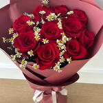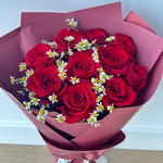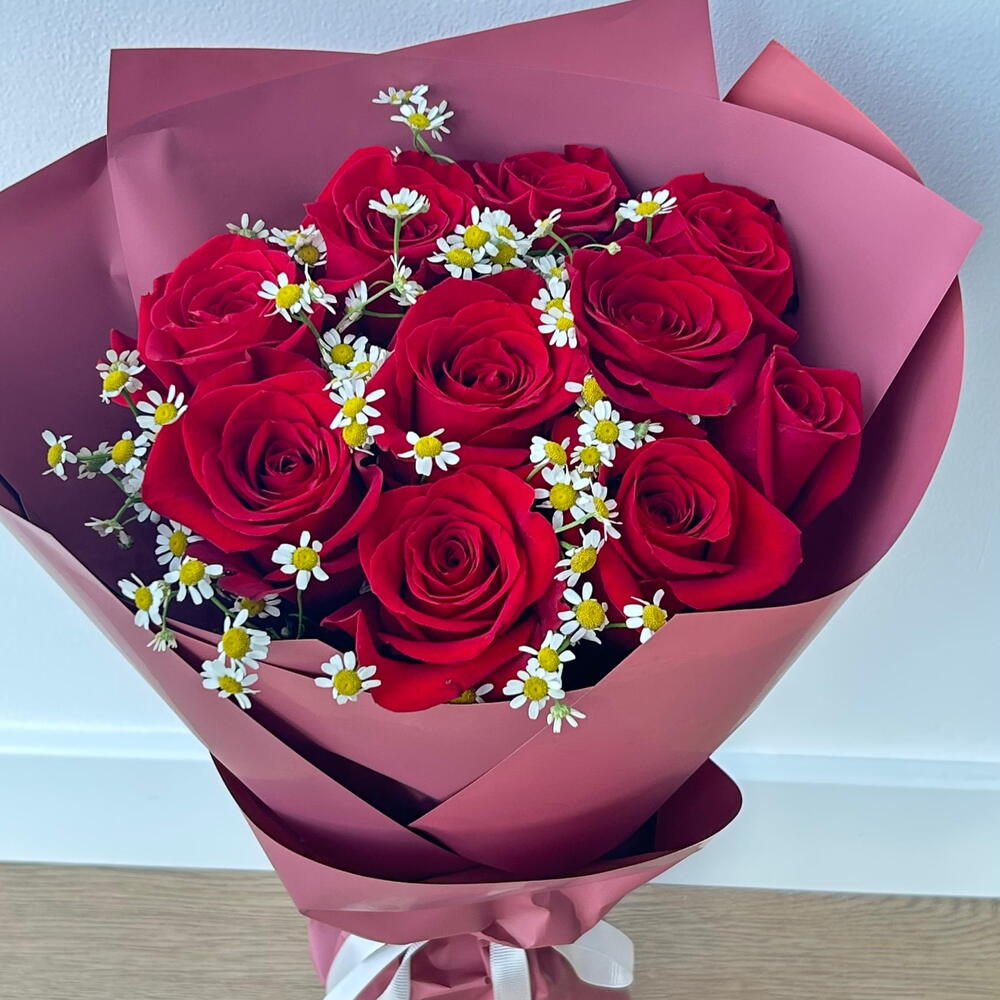 Красивый букет из 10 свежих красных роз, украшенный нежными белыми ромашками, & элегантной упаковкой.Идеально для романтических подарков, годовщин, дней рождения или особых торжеств