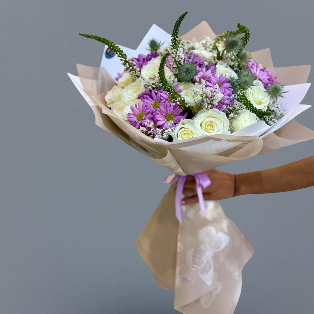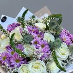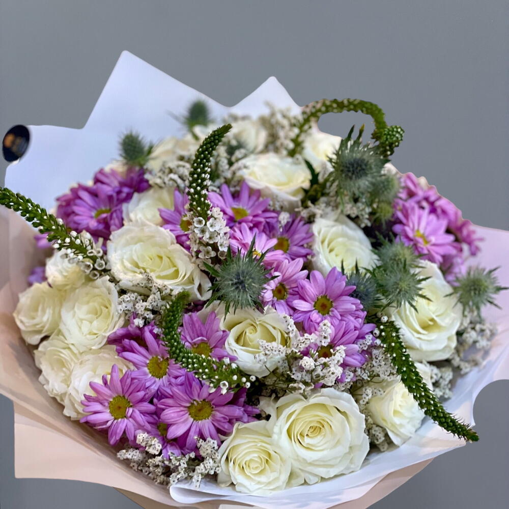 Veronica - 5 шт. purple chrysanthemum - 5 шт. white roses - 15 шт. ернгиоум - 2 шт.