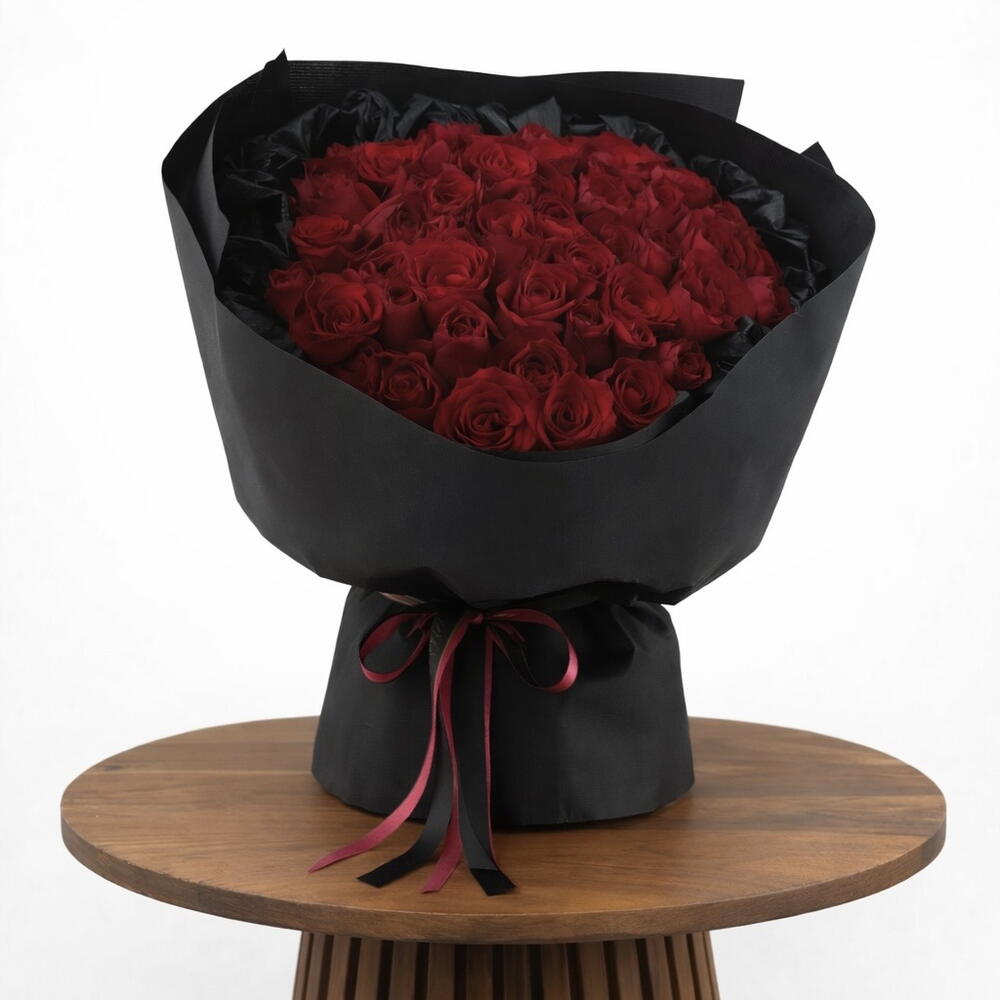 Очаруйте получателя этим шедевром контрастного цветочного дизайна. Это эффектное творение представляет собой массивный, идеально симметричный купол бархатистых багряных лепестков, которые эффектно выделяются на фоне фирменной матово-черной упаковки. 🌹🖤 ✨ Идеально для: ужинов в честь годовщины, стильных дней рождения, роскошных сюрпризов или современного «Я люблю тебя» для человека с безупречным вкусом. 😍💋