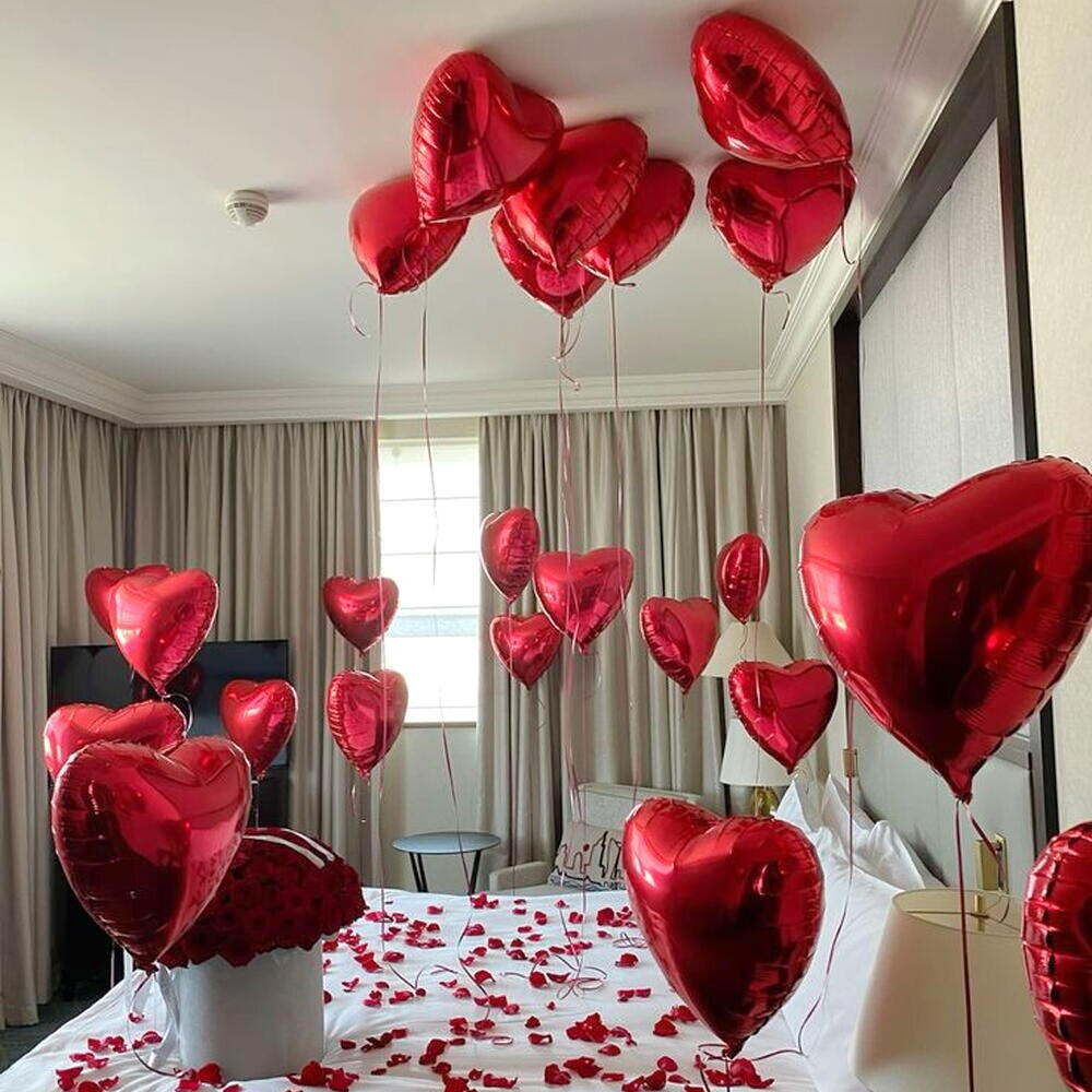 ● В набор входят 30 красных фольгированных гелиевых шаров в форме сердца, лепестки роз от 10 стеблей, разбросанные по кровати, и цветочная коробка премиум-класса со 100 красными розами. ● Забронируйте декор свадебного зала своей мечты прямо сейчас и зажгите романтику!
