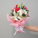 Нежный и изящный букет, представляющий собой очаровательное сочетание чисто-белых лилий, ярко-розовых гвоздик и нежно-розовых ромашек, красиво оформленный в элегантную розовую бумагу. Эта восхитительная композиция символизирует чистоту, любовь и восхищение, что делает её идеальным выбором для дней рождения, годовщин или просто чтобы выразить ваши искренние чувства. Перед тем как поставить стебли в свежую воду, обрежьте их под углом. Меняйте воду каждые два дня и держите букет вдали от прямых солнечных лучей и источников тепла. Удаляйте увядающие лепестки, чтобы сохранить свежесть и аромат.