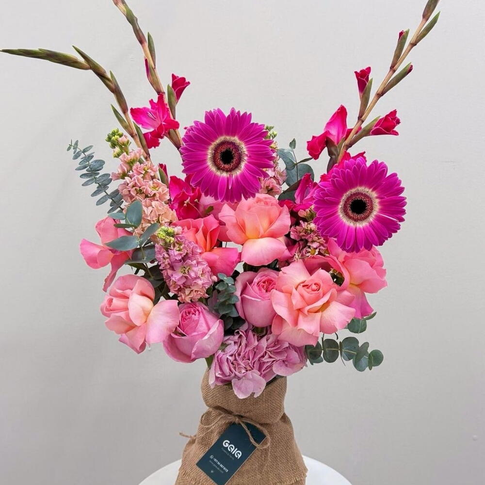Eucalyptus - 4 шт. hydrangeas - 1 шт. roses - 7 шт. цветы маттиолы - 2 шт. гербера - 2 шт. гладиолус (фуксиево-розовый) - 2 шт.