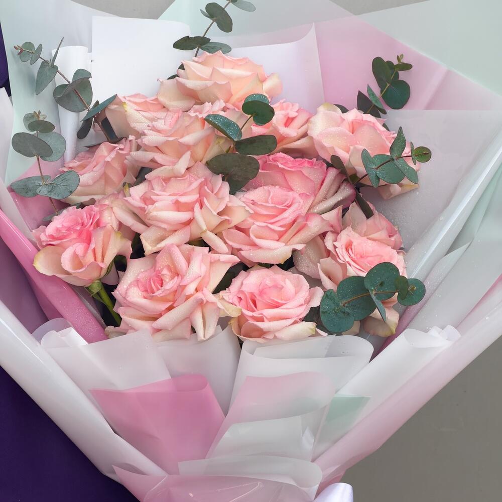 Ribbon - 1 шт. pink wrapping - 4 шт. белая упаковка - 3 шт. распустившаяся розовая роза - 15 шт.