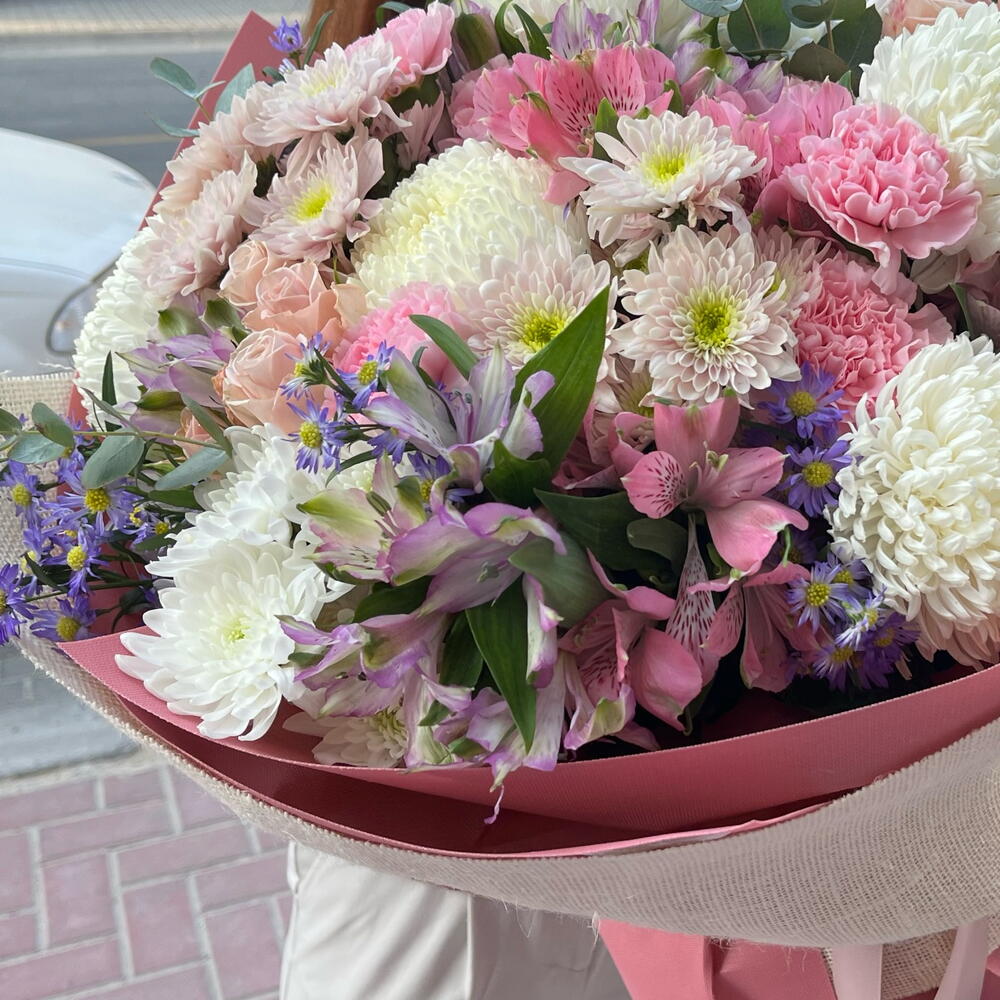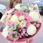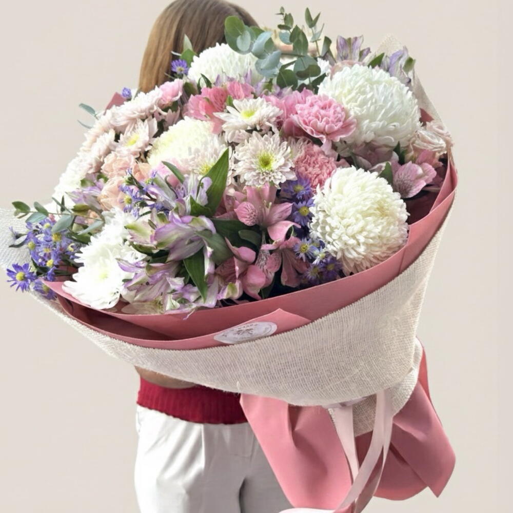Aster - 3 шт. carnation - 5 шт. white chrysanthemum - 3 шт. pink chrysanthemum - 3 шт. альстромерия - 6 шт. крышка - 6 шт. декоративная хризантема - 6 шт.