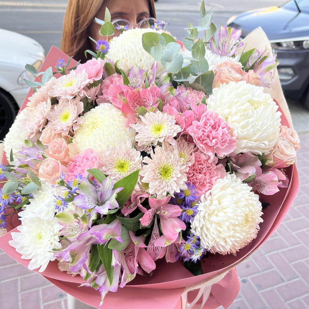 Букет пышный и выразительный, выполнен в мягкой пастельной палитре белого, нежно-розового и ненавязчивого лавандового/пурпурного. Он передаёт послание радости, изящества и искреннего восхищения в великолепном, но доступном стиле.