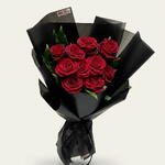 Букет представляет собой элегантную, эффектную композицию из десяти бархатистых красных роз в пышной зеленой листве, обернутых матовой черной бумагой, которая складывается в четкие, изящные панели. Черная лента, завязанная у стебля, добавляет роскоши и дерзости, подчеркивая яркие красные цветы на темном, изысканном фоне упаковки. В целом, образ выглядит стильно, романтично и современно-шикарно, идеально подходит для смелого подарка или эффектного элемента декора.