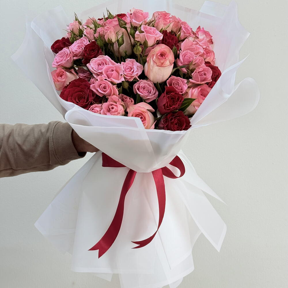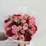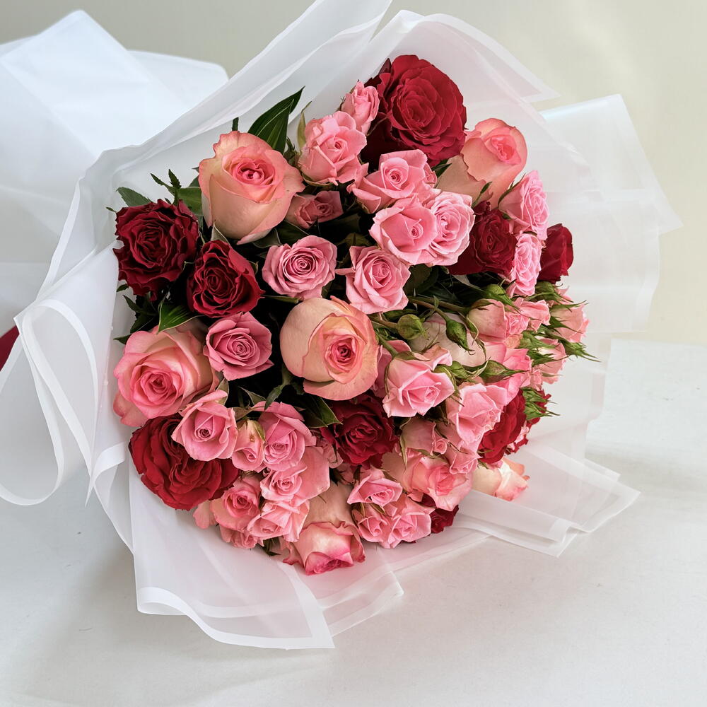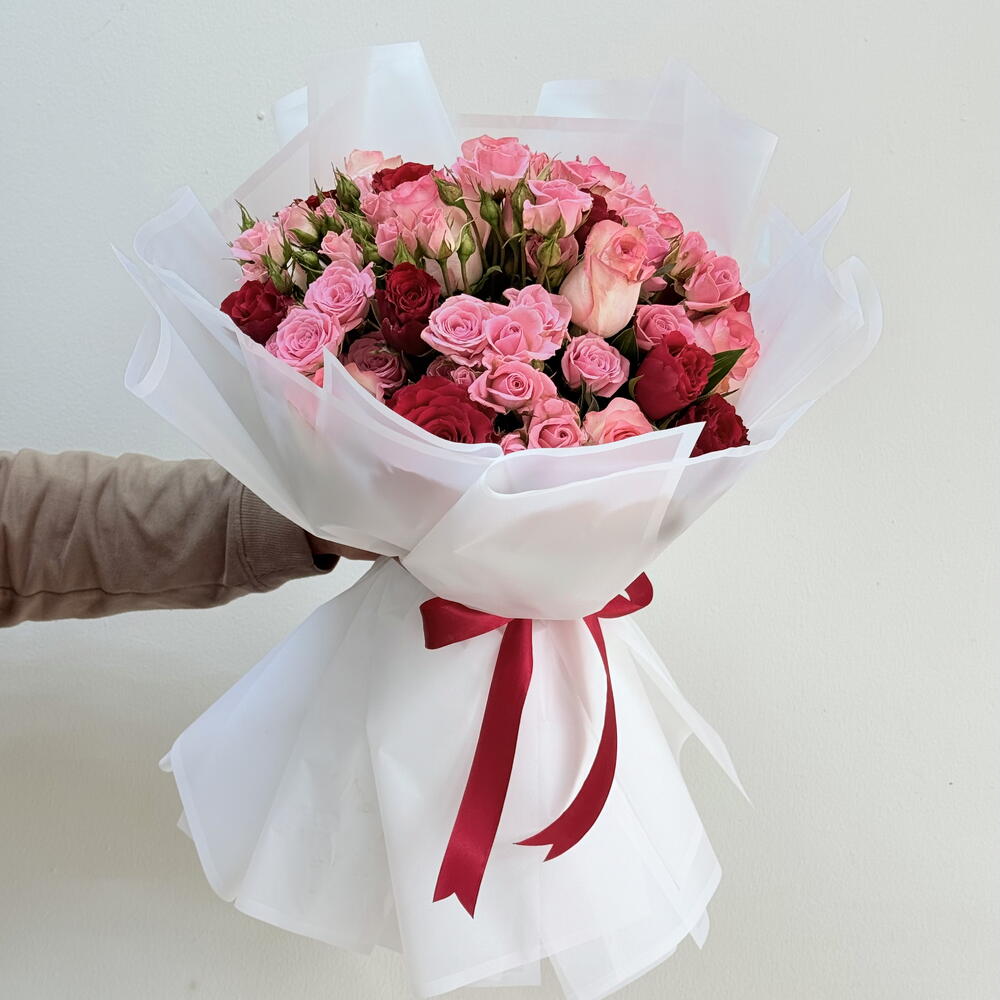 Этот очаровательный монобукет сочетает в себе пламенную страсть пяти красных роз и нежную невинность пяти розовых. Игривую изюминку композиции придают пять красных и пять розовых кустовых роз, привносящих нотку причудливости. Букет с любовью упакован в пять слоёв эстетически привлекательной бумаги и перевязан изящной лентой, что делает его идеальным подарком для выражения ваших чувств по любому поводу.