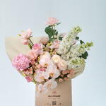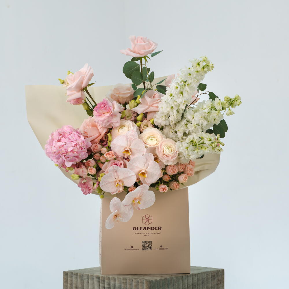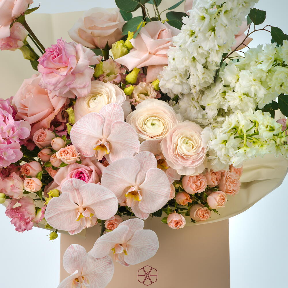 A dreamy all-pink bouquet of hydrangeas, chrysanthemums, orchids, white delphinium, and O’Hara roses—soft, playful, and full of romantic fantasy.