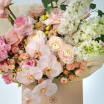 Spray rose - 10 шт. Lisianthus - 4 шт. Orchid - 1 шт. hydrangea pink - 3 шт. ohara - 10 шт. delphinium white - 3 шт.