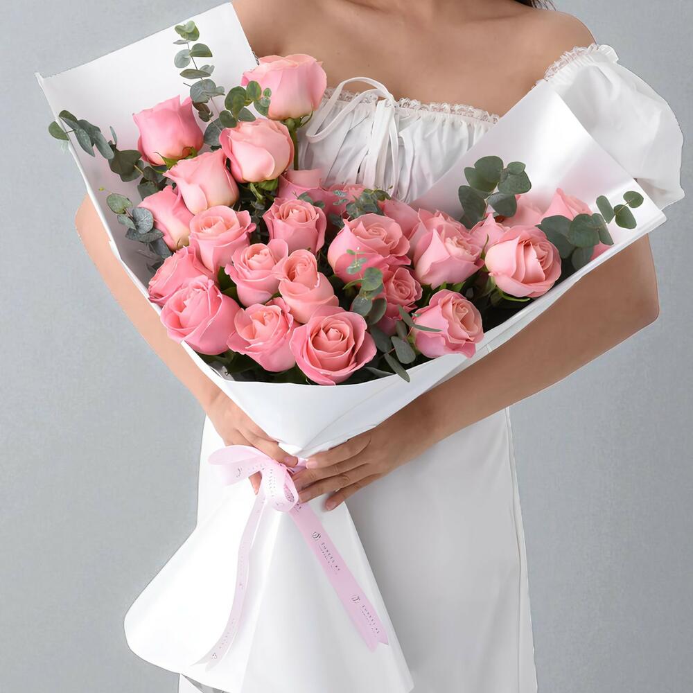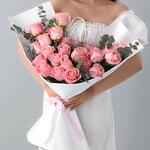 Своим изящным сочетанием нежно-розовых роз и пышной зелени этот букет — идеальный способ выразить любовь, восхищение и искренние чувства.