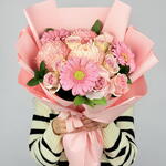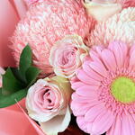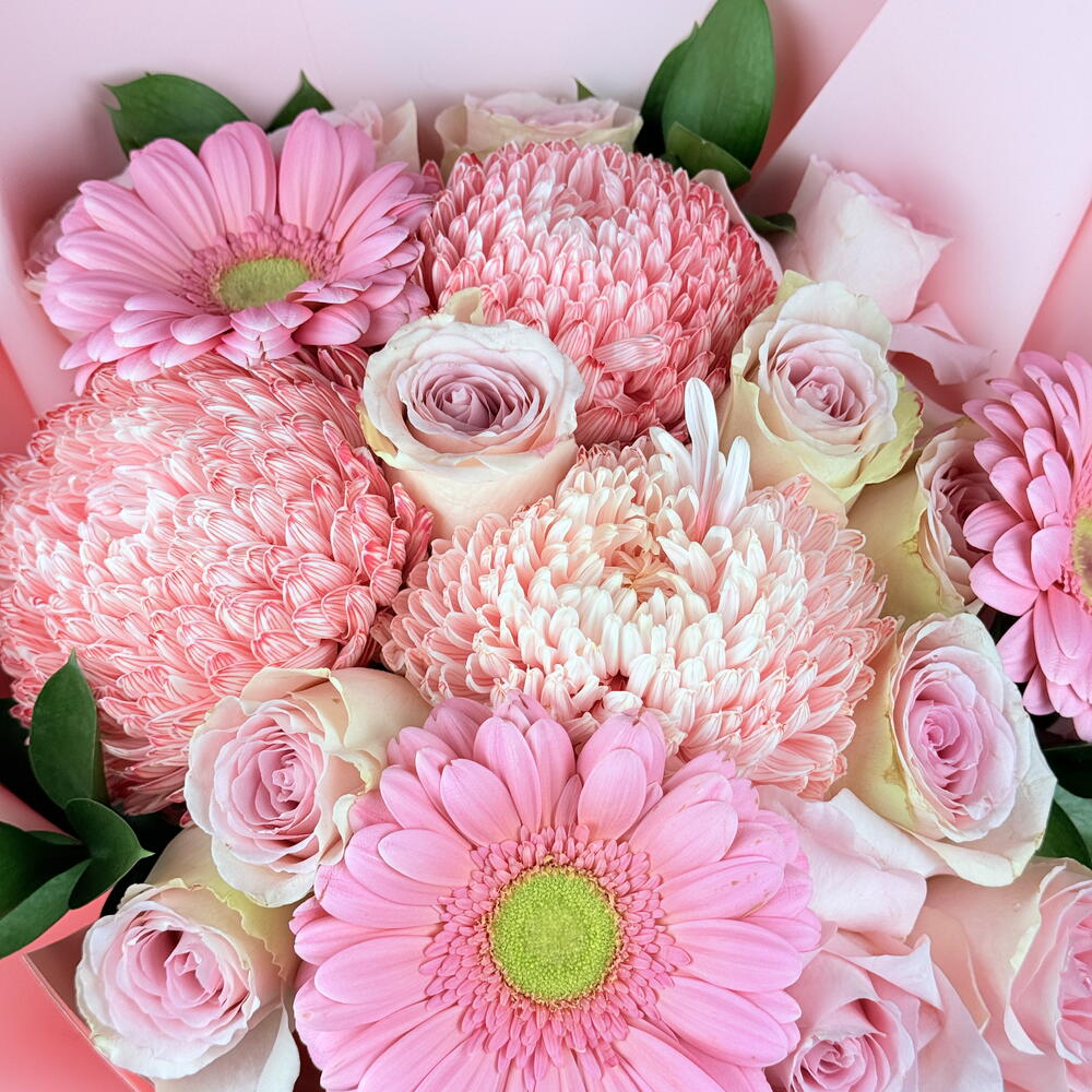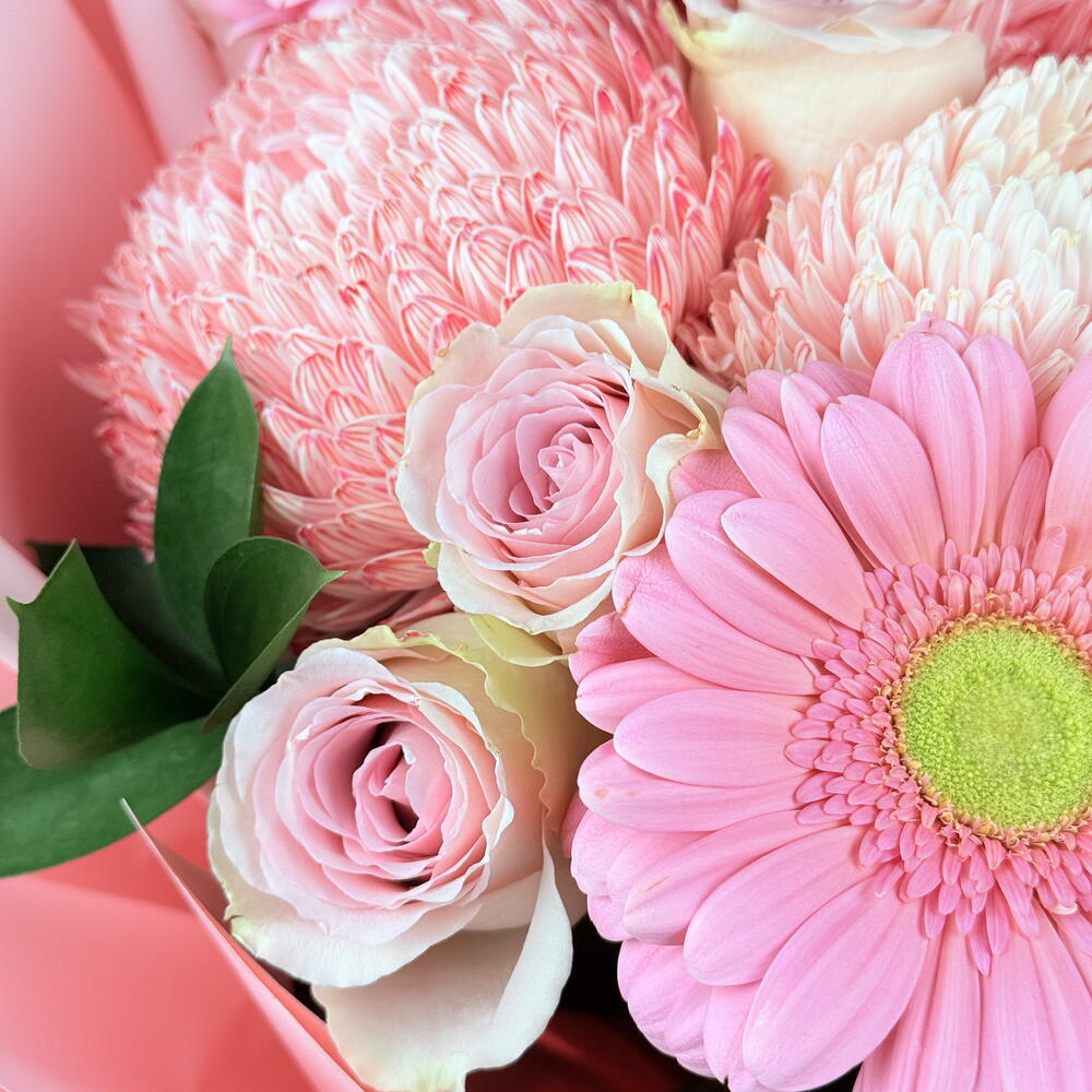 rose pink - 10 шт. gerbera pink - 3 шт. листья и прочее. - 5 шт. декоративная бледная хризантема - 3 шт.