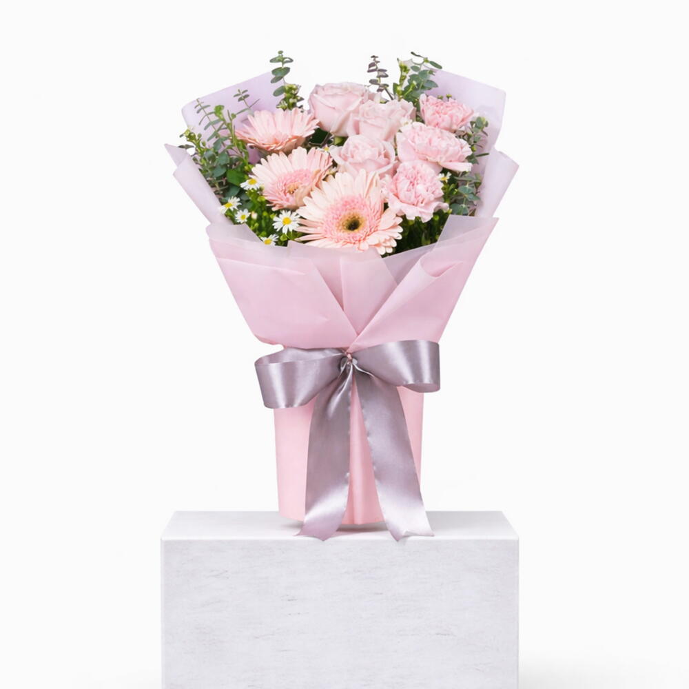 Розовые розы, смешанные с гвоздикой и ромашкой — нежные текстурные слои. Розовая гербера 3 стебля, Светло-розовая роза 3 стебля, Светло-розовая гвоздика 3 стебля, Ромашка 2 стебля, Эвкалипт 3 стебля
