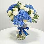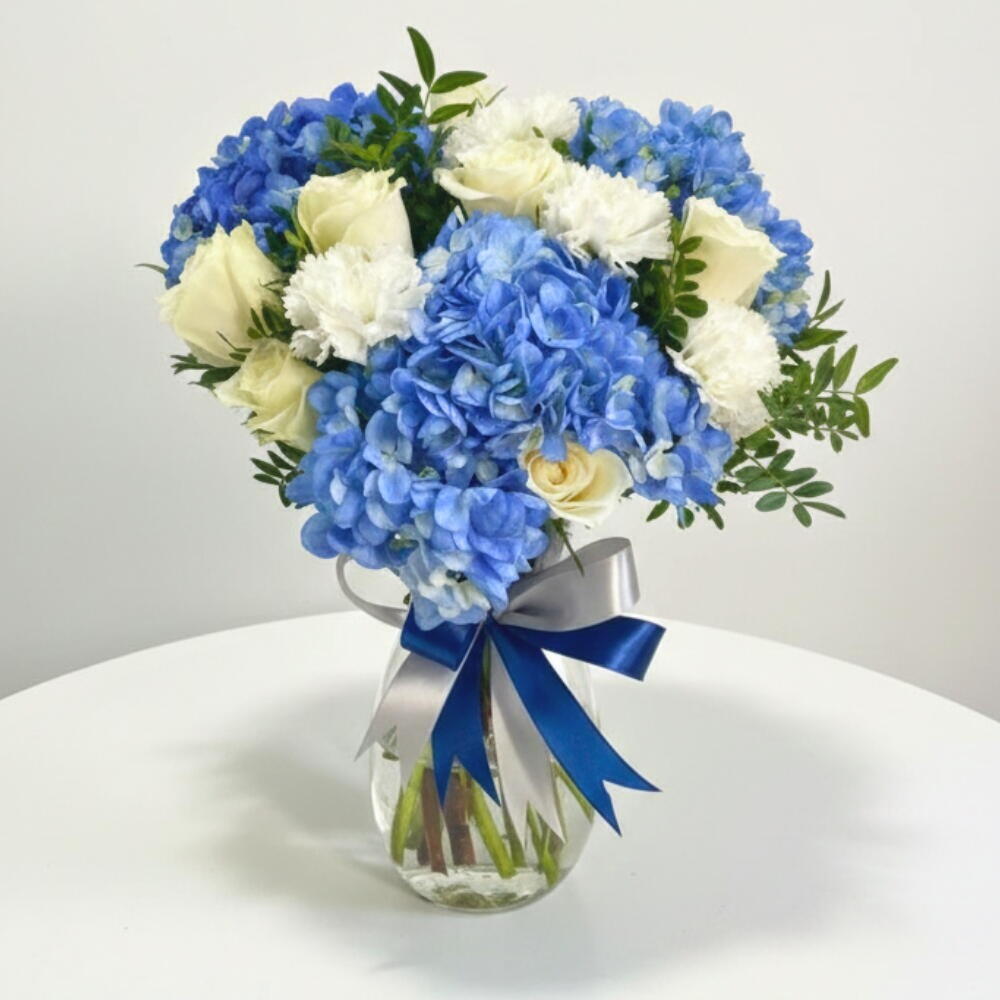 Нежная гармония синего, белого и мягкой элегантности – эта композиция объединяет цветы, которые говорят на языке чистоты, спокойствия и утонченной красоты. Сердце букета составляют три насыщенно-голубые гортензии – пышные, словно облака, соцветия, символизирующие благодарность, понимание и глубину чувств. Их прохладный голубой оттенок создает успокаивающий визуальный баланс, который сразу же притягивает взгляд. Их окружают пять белых гвоздик, известных своей свежестью, долголетием и мягкими гофрированными лепестками. Белые гвоздики символизируют чистую любовь, восхищение и новое начало, что делает их выразительным дополнением к гортензиям. Чтобы сделать композицию еще более изысканной, добавлены шесть белоснежных роз, привносящих классическое очарование и роскошь. Символизируя элегантность, невинность и искреннее уважение, розы связывают воедино всю цветовую палитру, создавая букет, который одновременно современен и неподвластен времени. Все цветы расположены в стильной стеклянной вазе Matka, что придаёт букету современный, минималистичный вид, который прекрасно впишется в любое пространство — от дома до офиса. Идеально подобранная лента (35×40 см) добавляет последний штрих, усиливая впечатление от композиции мастерством и вниманием к деталям.