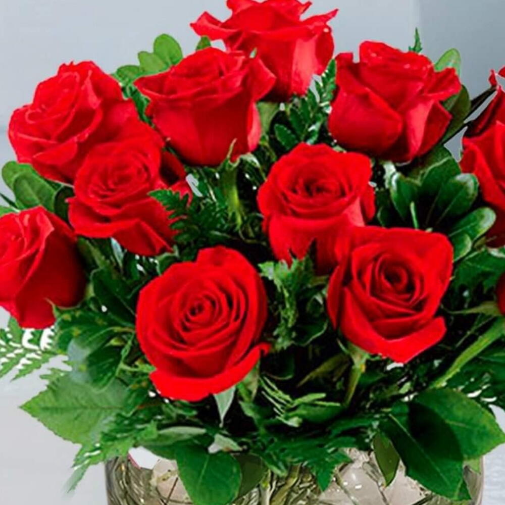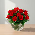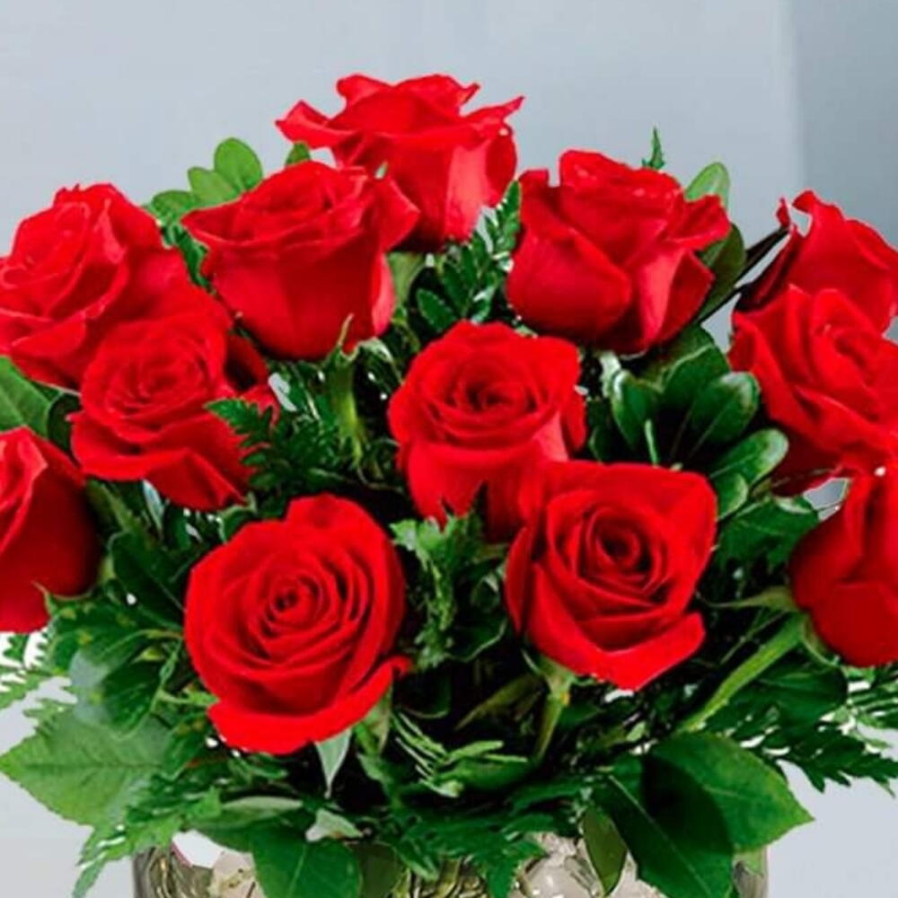 Red rose - 12 шт. Green leaves - 10 шт. Vase - 1 шт. ruscus israel - 5 шт.