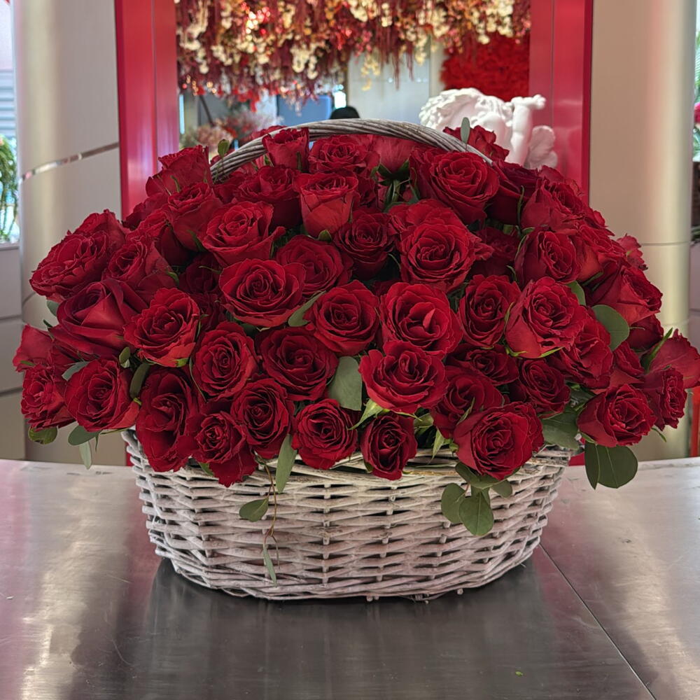 Великолепная и роскошная композиция из 150 отборных красных роз, элегантно упакованная в классическую корзину. Эта композиция «Алая страсть» — высшее выражение глубокого восхищения, романтики и роскоши — поистине великолепный подарок для торжественного случая, годовщины или знаменательного события. Большой размер — 150 красных роз
