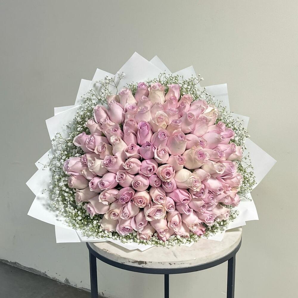 Завораживающая композиция с десятками очаровательных розовых роз, прекрасно дополненная ореолом нежной белой гипсофилы. Изящно завернутый в белую ткань с элегантной лентой, этот букет символизирует восхищение, сладость и сердечную привязанность — идеальный выбор для выражения любви, празднования важных вех или чтобы сделать чей‑то день незабываемым.