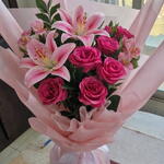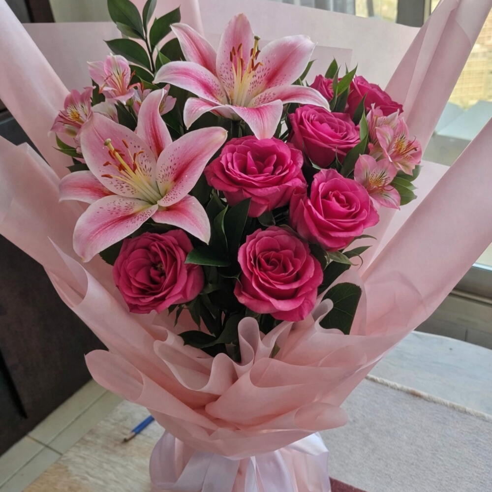 pink lilies - 2 шт. листья рускуса - 4 шт. розовая альстромерия - 2 шт. роза рани-пинк - 6 шт.
