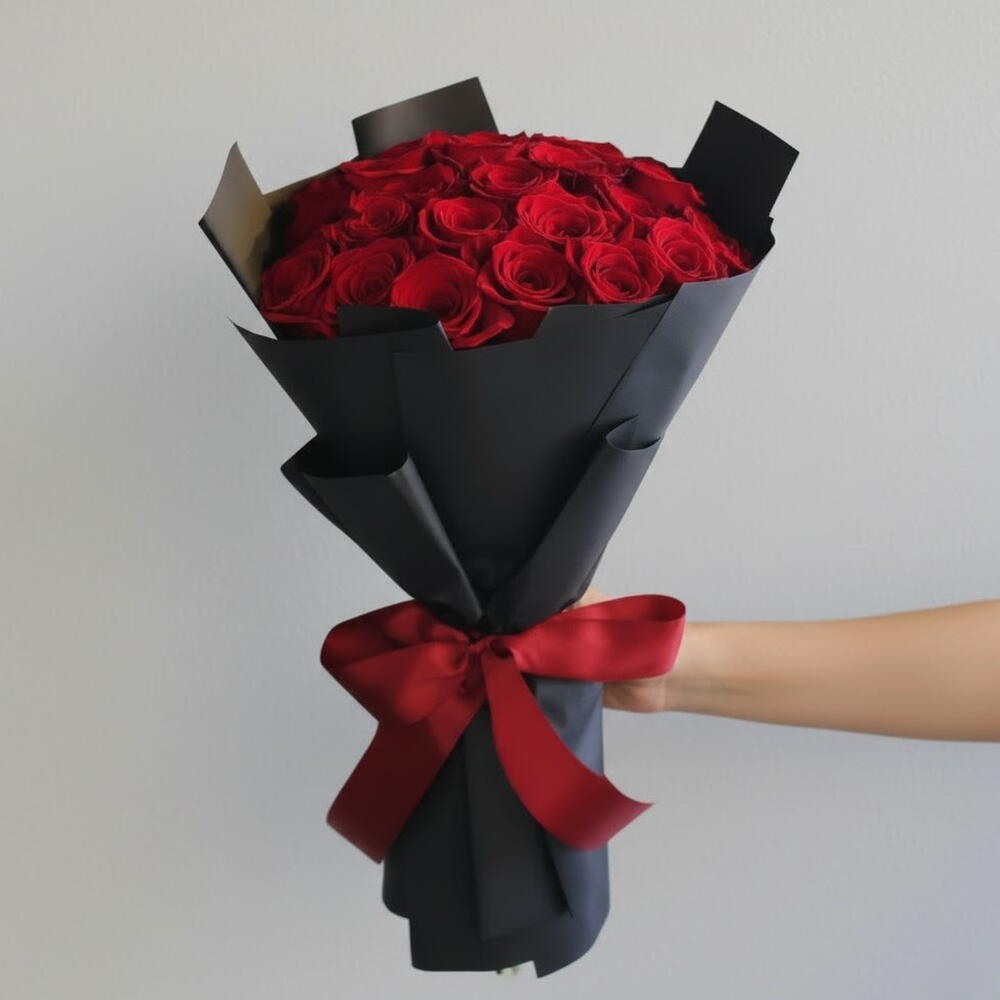 Этот роскошный букет глубоких красных роз завернут в элегантную матовую черную бумагу и украшен насыщенной красной атласной лентой для драматичного, вневременного образа. Бархатные розы символизируют любовь, страсть и преданность, что делает эту композицию идеальным выбором для романтических случаев или значимых торжеств. Минималистичная черная упаковка усиливает насыщенность красных бутонов и добавляет современную, утонченную нотку. Букет производит поразительное впечатление с первого взгляда и подойдет как ценителям классики, так и приверженцам современного стиля. Чтобы цветы оставались свежими, как можно скорее поместите букет в чистую воду и подрежьте стебли под углом перед размещением. Держите букет вдали от прямых солнечных лучей, сквозняков и источников тепла, а для максимальной долговечности меняйте воду ежедневно.