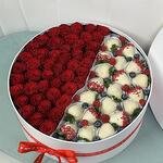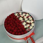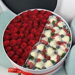 Every day we get fresh strawberries, which we temper in premium Belgian chocolate Calebaut. We do not make blanks, all compositions are prepared after the order is received. Ingredients: 20 chocolate covered strawberries + 45 roses (depends on size). Packaging: Round box