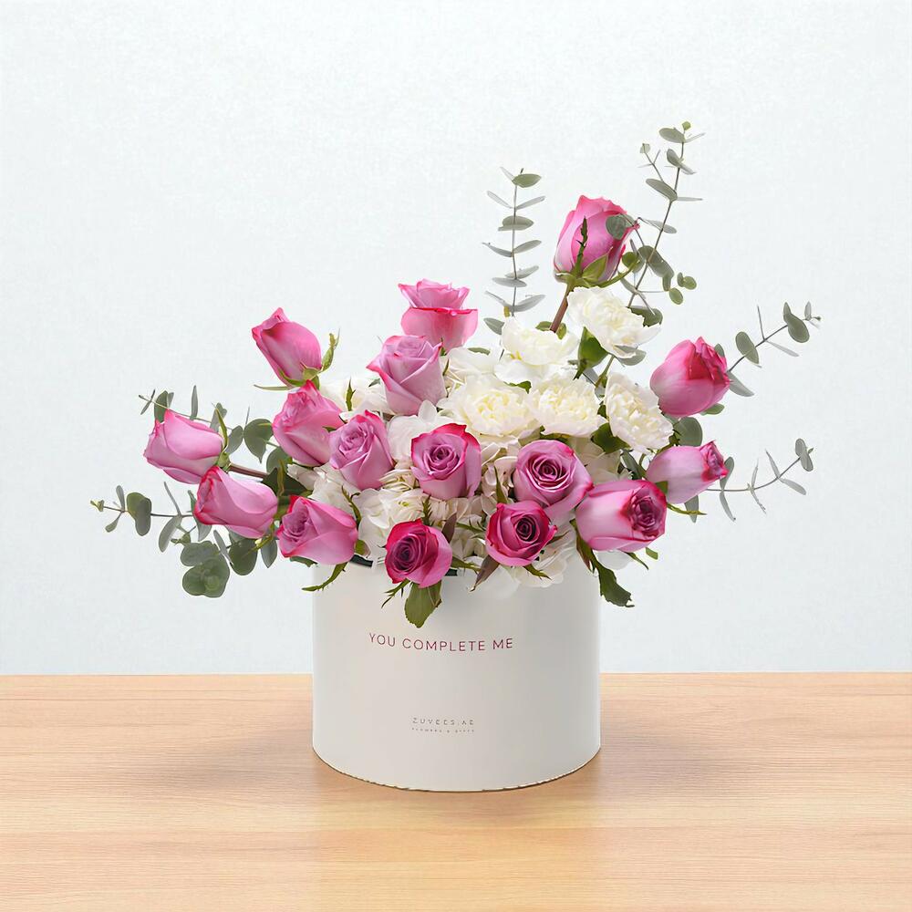 Отпразднуйте вечную любовь с Royal Amethyst – You Complete Me Bloom Box — роскошной и трогательной цветочной композицией, которая красиво выражает связь и преданность. В составе: 16 насыщенно-фиолетовых роз, 2 белые гортензии, 5 белых гвоздик и 4 веточки эвкалипта — поэтичное сочетание страсти, чистоты и спокойствия. Оформлен в премиальной круглой чёрной коробке с романтической надписью «You Complete Me», этот букет — идеальный жест для годовщин, душевных сюрпризов или особых романтических моментов, которые заслуживают долгих воспоминаний.