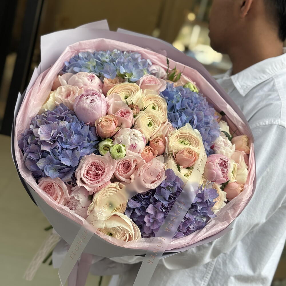 7 Гортензия морская пурпурная, 23 Роза охара розовая, 15 Пион Сара, 9 Лютик очень светло-розовый, 9 Роза спрей клубничный пирог. Букет выполнен в стиле премиум-класса XL (50–60 см) с элегантной упаковкой и отделкой лентой.