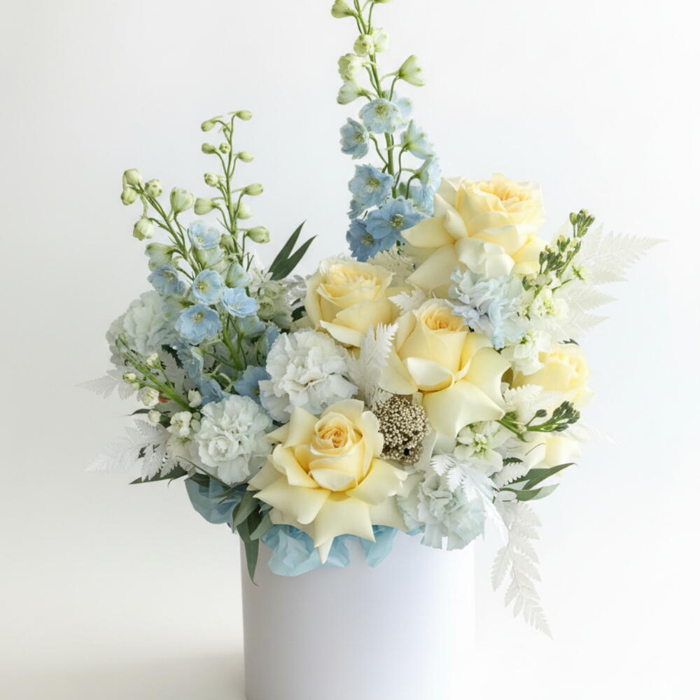 Погрузитесь в спокойствие этого моно-букета — композиции из нежных цветов, где классическая красота встречается с современной элегантностью. В него входят три пышные персиковые розы — романтика мягких оттенков, окружённые рядом из пяти светло-голубых окрашенных гвоздик, создающих умиротворяющую атмосферу. Дополнительно букет обогащён очарованием светло-голубых маттиол, придающих нотку сияния. Этот букет — изысканное акцентное изделие, идеально подходящее для украшения любой обстановки своей сдержанной элегантностью.