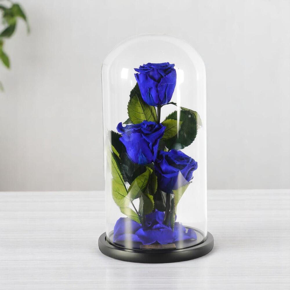 Трио королевско-синих стабилизированных роз в стеклянном куполе