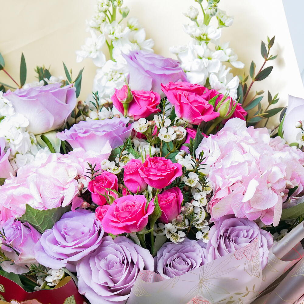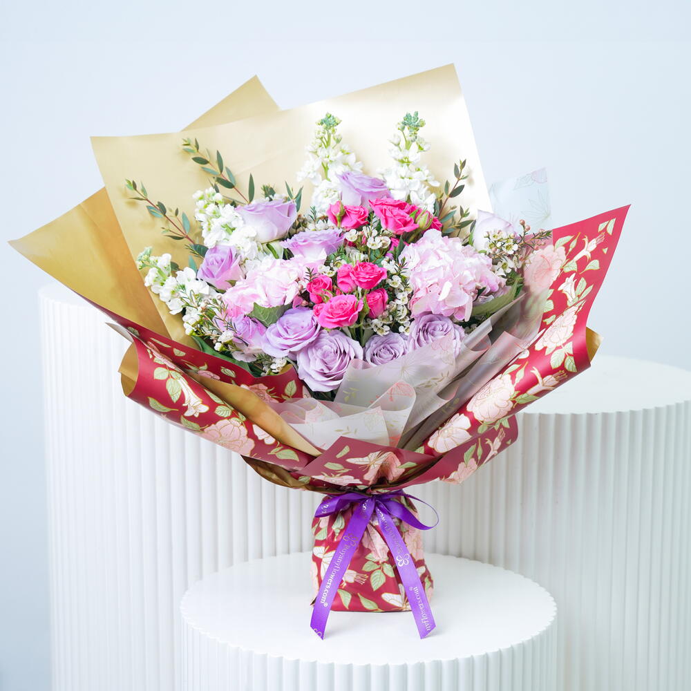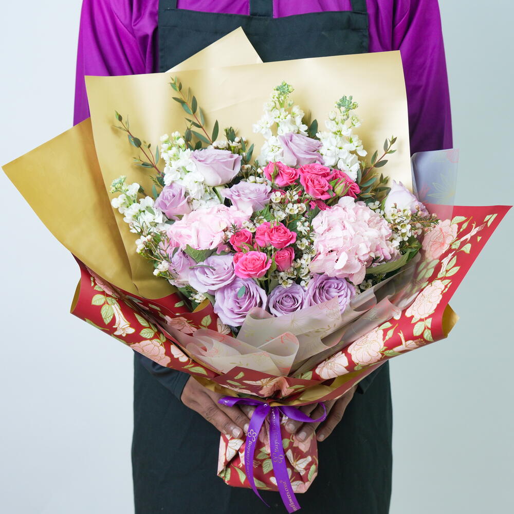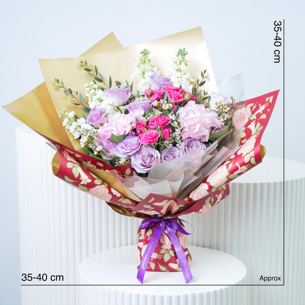 10 светло-фиолетовых роз 4 белые маттиолы 2 розовые гортензии 2 тёмно-розовые мини-розы 3 стебля белого воскового цветка Завернуто в двухцветную красно-золотую бумагу Оформлено прозрачной дизайнерской бумагой Перевязано тёмно-фиолетовой лентой Размеры Высота – 40 см Ширина – 38 см