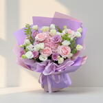 Порадуйте маму нашим смешанным букетом роз розового, фиолетового и белого оттенков: 5 розовых, 5 эффектных фиолетовых и 3 классические белые розы, красиво дополненные пышной розовой гортензией в центре. Нежные белые цветы эустомы придают мягкость и элегантность, а свежая зелень подчёркивает природное очарование букета. Идеально для Дня матери или в качестве роскошного подарка, эта яркая и романтичная композиция выражает любовь, радость и искреннюю признательность в каждом стебле. 🌸💜💖