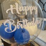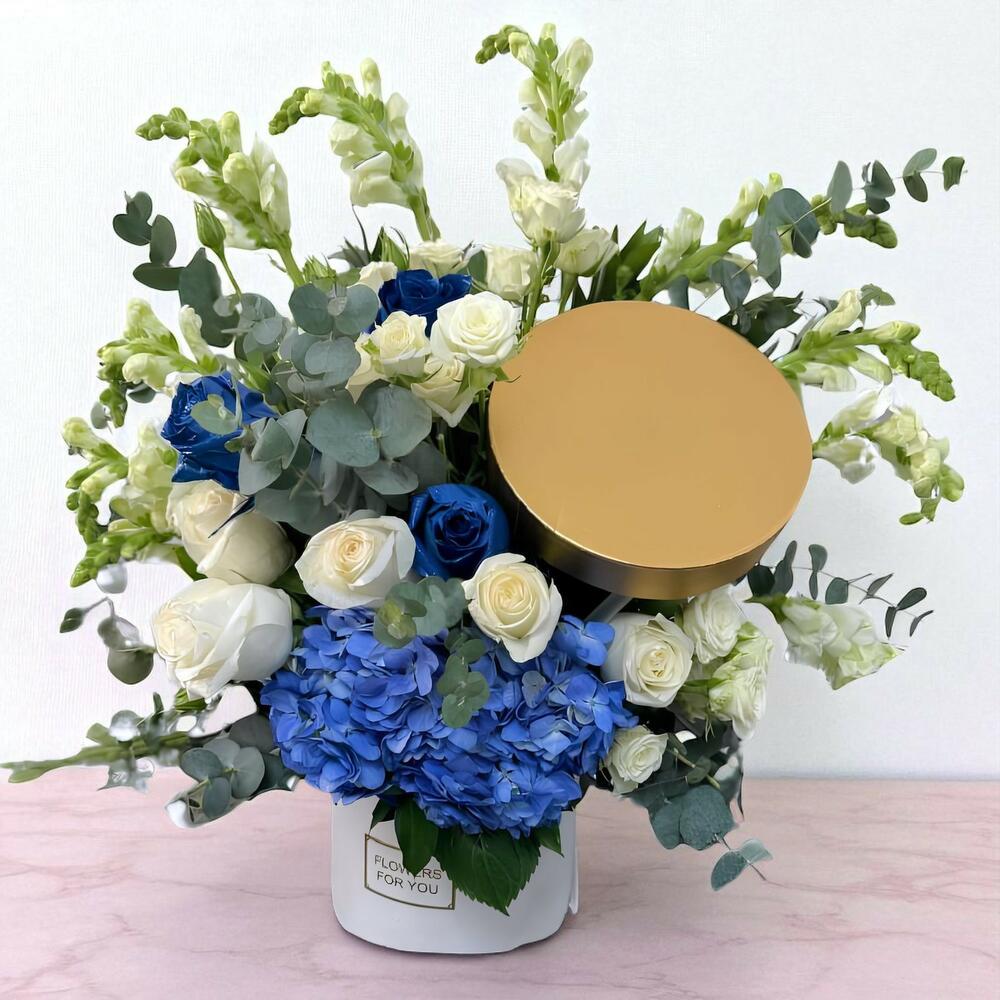 Snapdragon - 10 шт. голубые гортензии - 1 шт. маленькая роза - 5 шт. white roses - 5 шт. blue roses - 3 шт. листья эвкалипта - 3 шт. гелиевый шар-бобо с 4 шариками внутри и запиской «С днём рождения» - 1 шт.