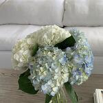 Этот элегантный букет представляет собой изящную композицию нежных белых и голубых гортензий, красиво оформленных в прозрачной стеклянной вазе. Пушистые, похожие на облака соцветия создают умиротворяющее и успокаивающее зрелище, символизируя грацию, чистоту и искренние чувства. Окружённый пышной зеленью, этот букет прекрасно подходит для выражения мира, утешения или нежной привязанности — он идеален для свадеб, вечеринок в честь будущего малыша, подарков в знак соболезнования или минималистичного домашнего декора.