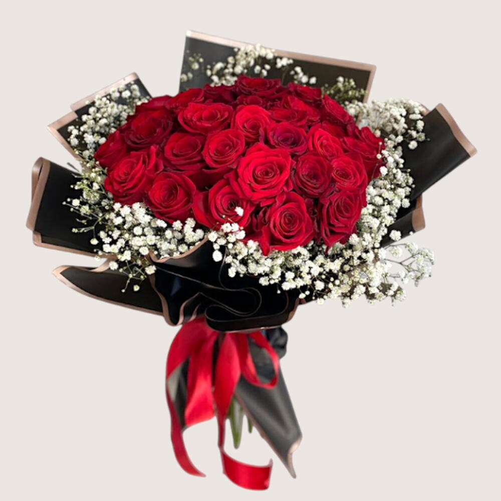 Потрясающая композиция ко Дню святого Валентина включающая 50 великолепных красных роз с крупными бутонами дополненная 8 нежными стеблями гипсофилы Идеально подходит для выражения глубоких чувств в этот особенный день