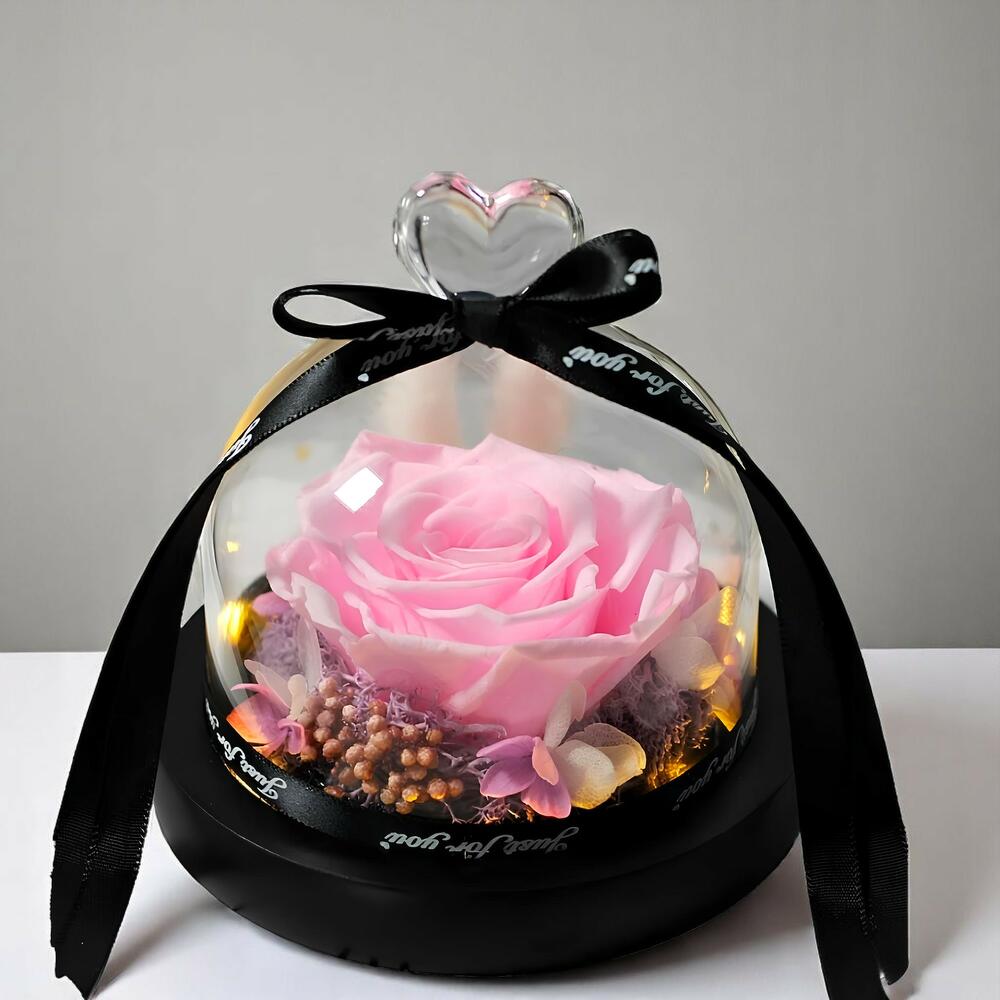 Royal Pink — очаровательная и нежная цветочная композиция, созданная, чтобы покорять сердца. Под прозрачным куполом, увенчанным ручкой в форме сердца, эта стабилизированная роза розового цвета окружена мягкими акцентными цветами.