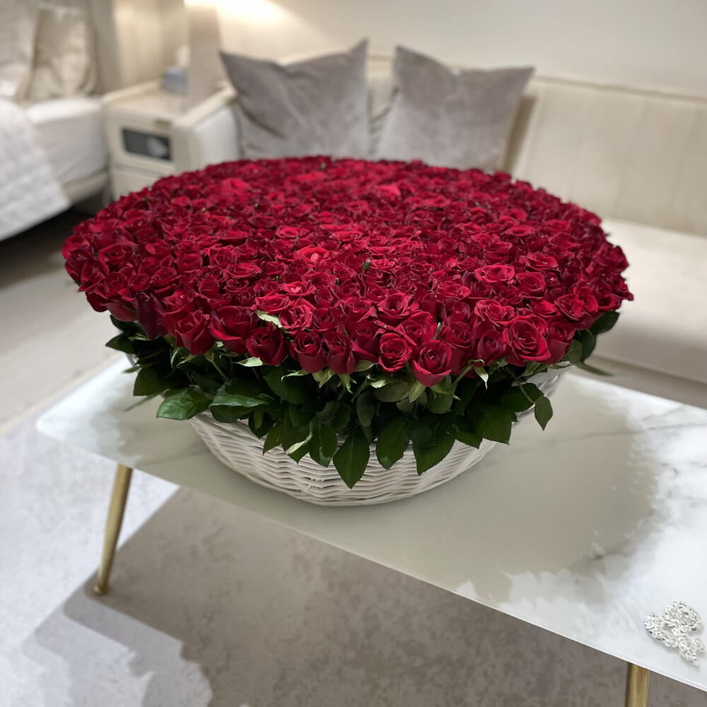 большая белая корзина - 1 шт. розы красные - 375 шт.