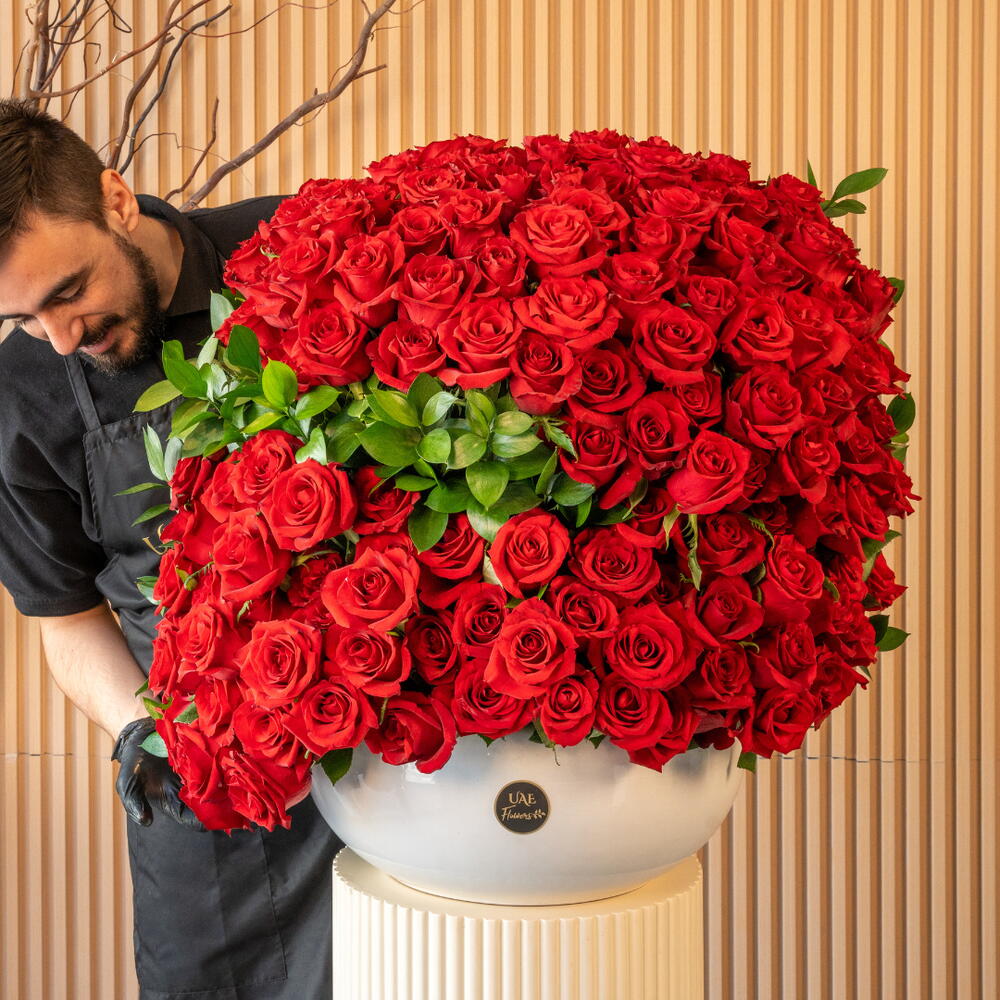 Переполненная роскошными красными розами, композиция Royal Red — высший символ любви, страсти и величия. Оформленная в элегантной белой вазе, эта захватывающая дух цветочная композиция создана, чтобы впечатлять и очаровывать.