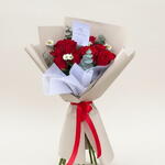 Букет оформлен красными розами как основными цветами, дополненными небольшими белыми ромашками и зелёной листвой эвкалипта. Букет завернут в бежевую бумагу, выстланную белой тишью, и перевязан ярко-красной лентой бантом у основания стеблей. В композицию вложена небольшая белая поздравительная открытка.