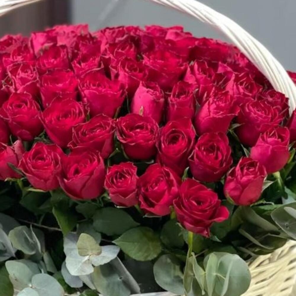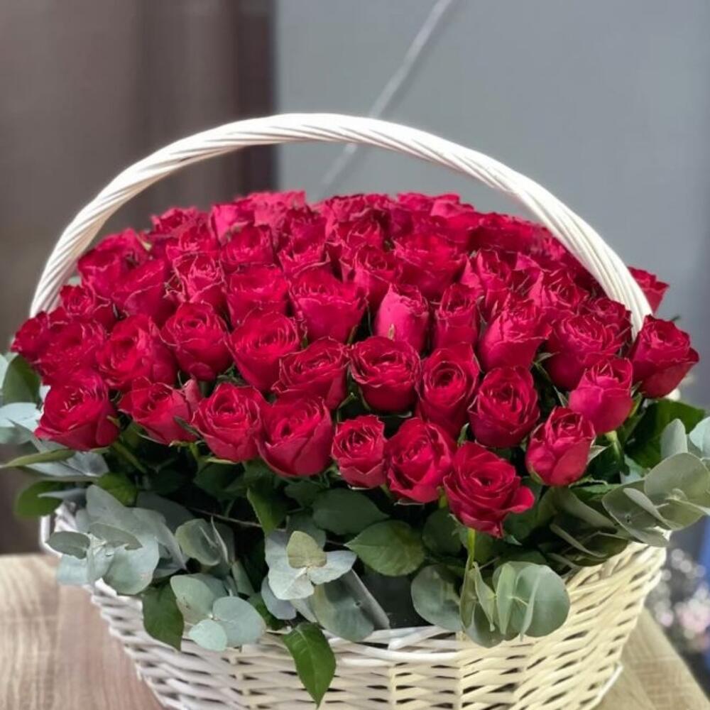 Basket - 1 шт. eucalyptus leaves - 10 шт. миниатюрные красные розы - 101 шт.