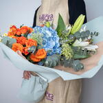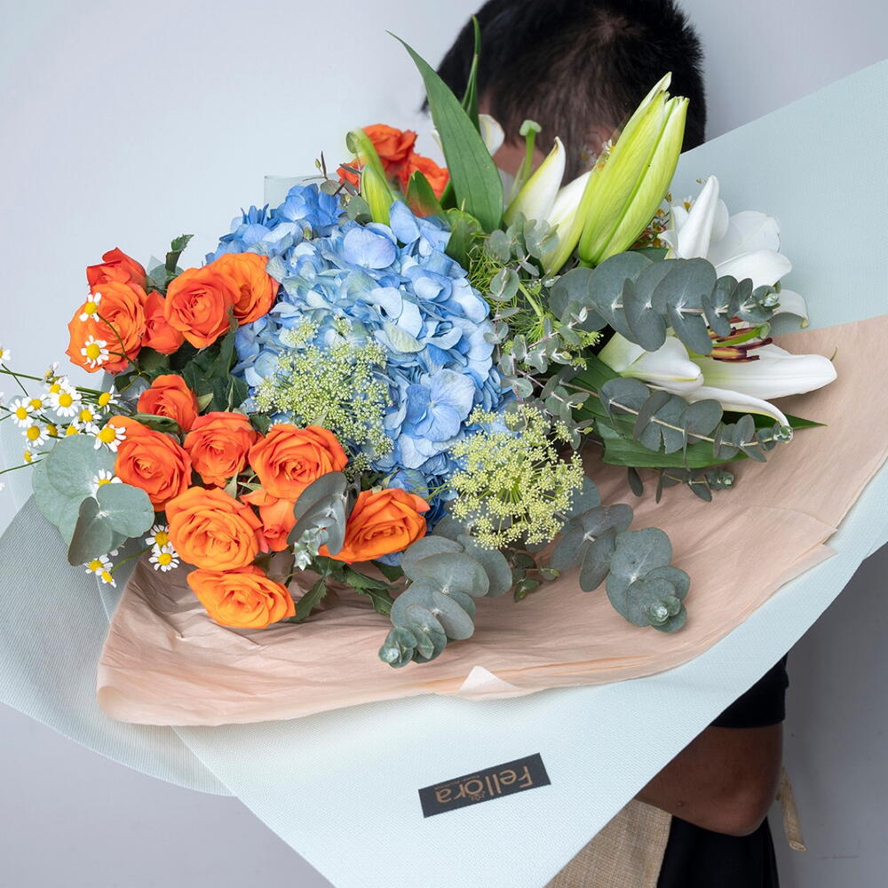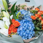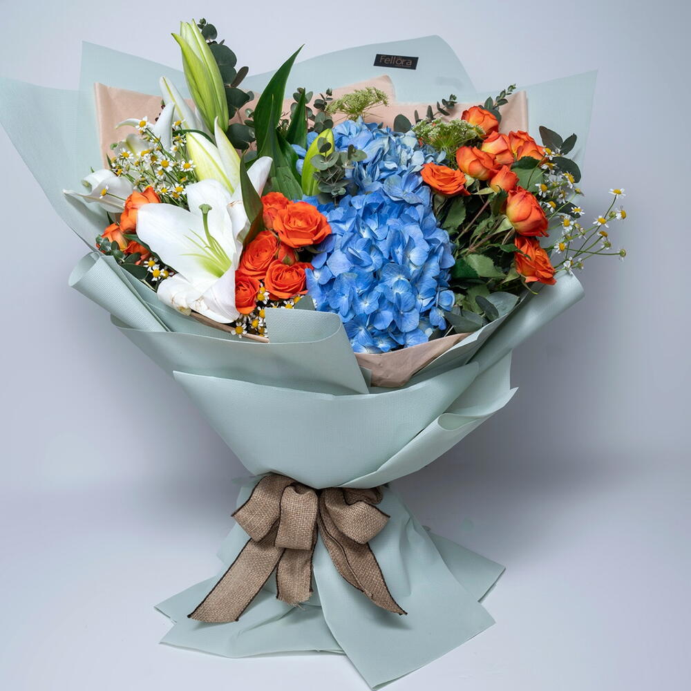 Ribbon - 1 шт. packaging - 2 шт. white lilies stems - 2 шт. orange spray rose - 4 шт. blue hydrangea - 2 шт. tanacetum spray daisy - 5 шт. амми майорский - 3 шт. листья эвкалипта - 3 шт.