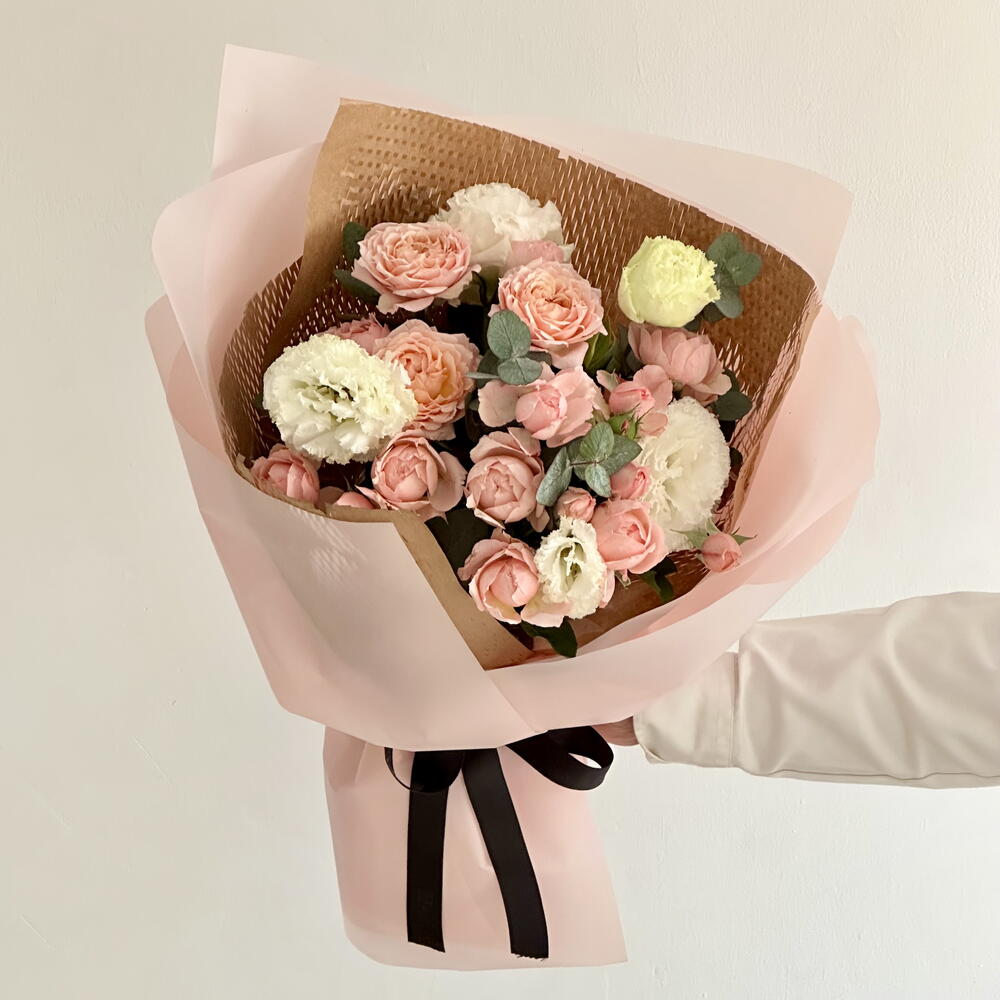 Букет Rustic Grace — очаровательная композиция, сочетающая мягкость с природной элегантностью. В него входят нежные розы Julietta, безупречно белая эустома и пышный эвкалипт; композиция красиво подчеркнута фактурной скиммией, придающей уникальный штрих. Упакованный в изысканном сочетании розового и коричневого, этот букет излучает тепло и утонченную красоту, делая его идеальным для любого искреннего повода.