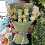 белая бумага - 3 шт. ветки эвкалипта - 4 шт. стебли белого лизиантуса - 3 шт. white roses stems - 25 шт. пастельно-зелёная бумага - 2 шт.
