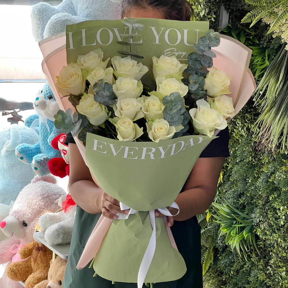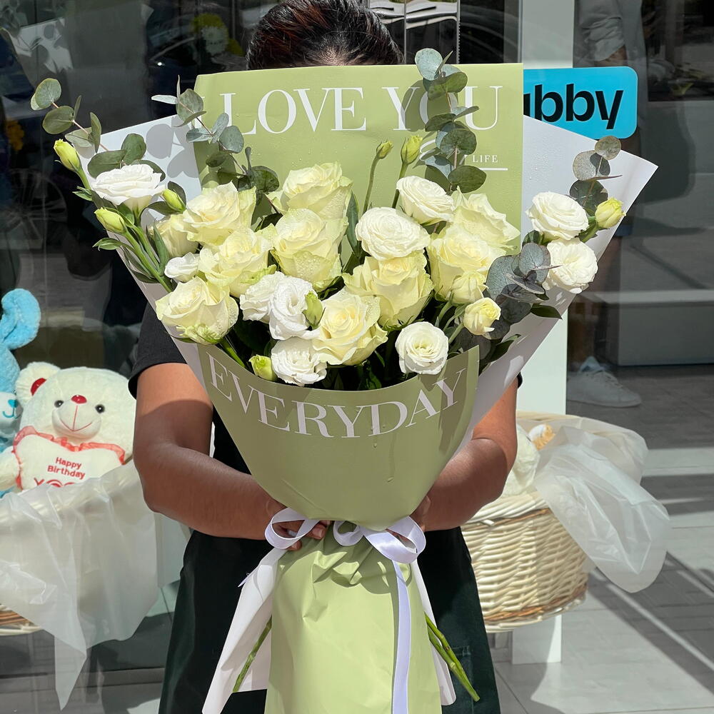 белая бумага - 3 шт. ветки эвкалипта - 4 шт. стебли белого лизиантуса - 3 шт. white roses stems - 25 шт. пастельно-зелёная бумага - 2 шт.