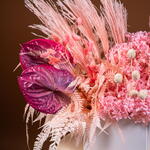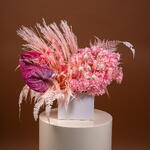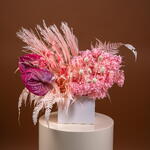 сухая розовая гортензия - 2 шт. сухой лист папоротника - 6 шт. будда пампасы - 7 шт. сухая белая краспедия - 7 шт. сухой фаларис - 15 шт.