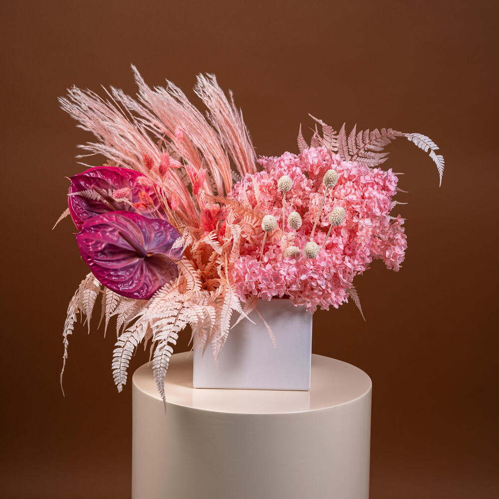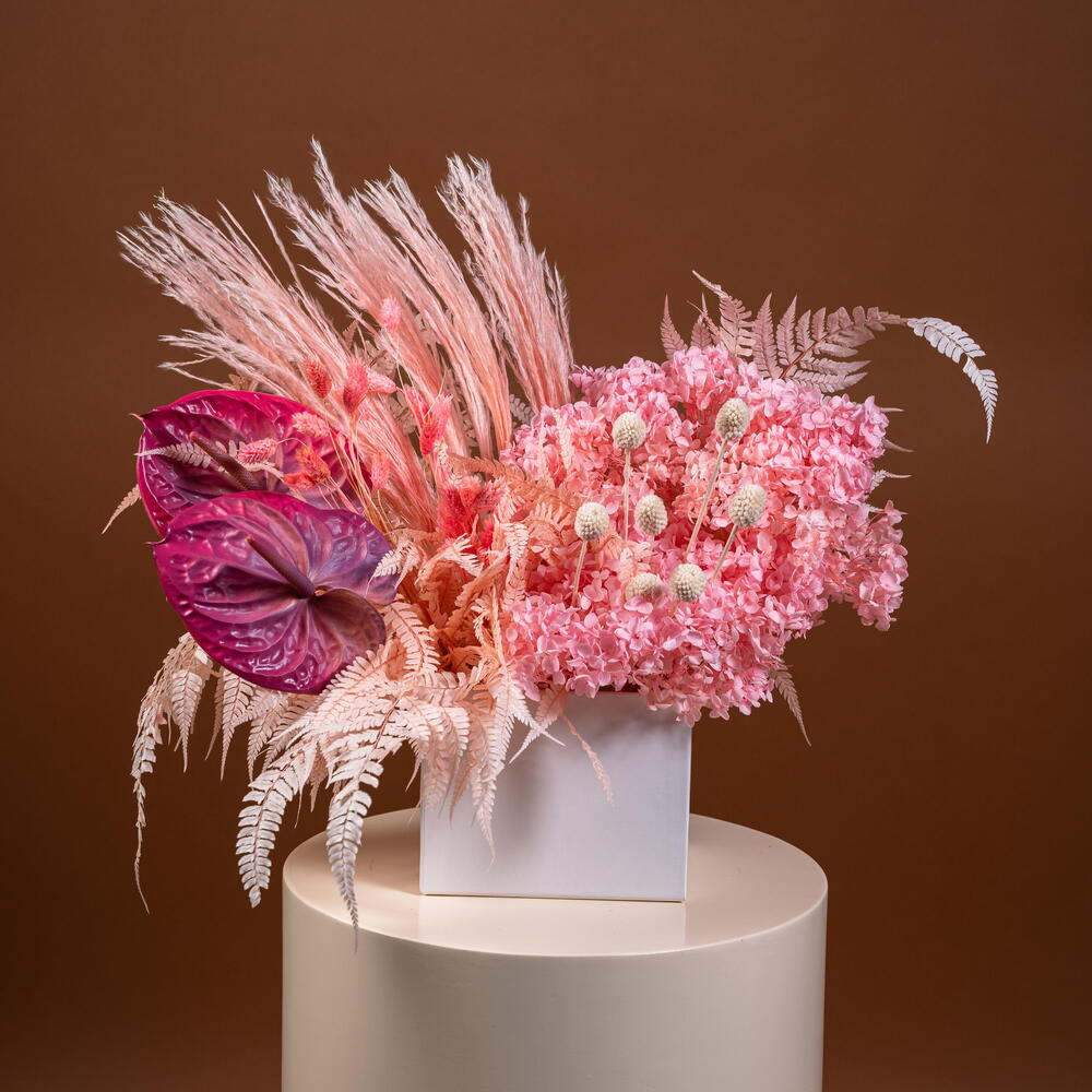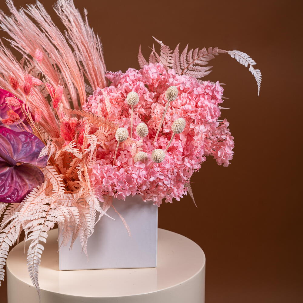 сухая розовая гортензия - 2 шт. сухой лист папоротника - 6 шт. будда пампасы - 7 шт. сухая белая краспедия - 7 шт. сухой фаларис - 15 шт.