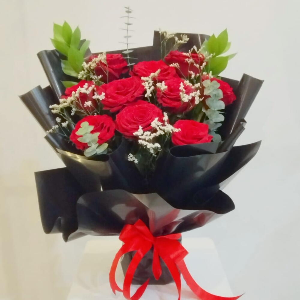 Red rose - 11 шт. Eucalyptus - 2 шт. листья рускуса - 3 шт. lumonium белый - 5 шт.