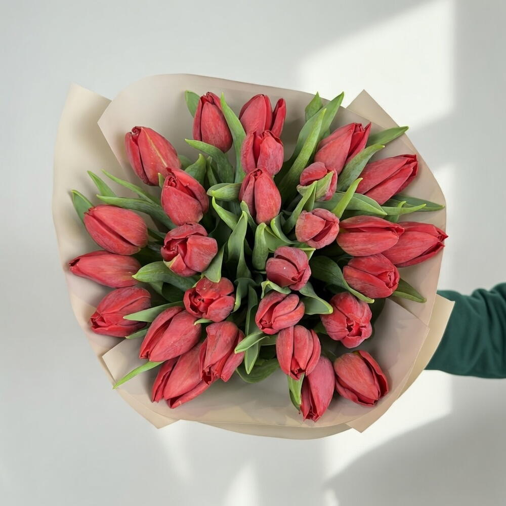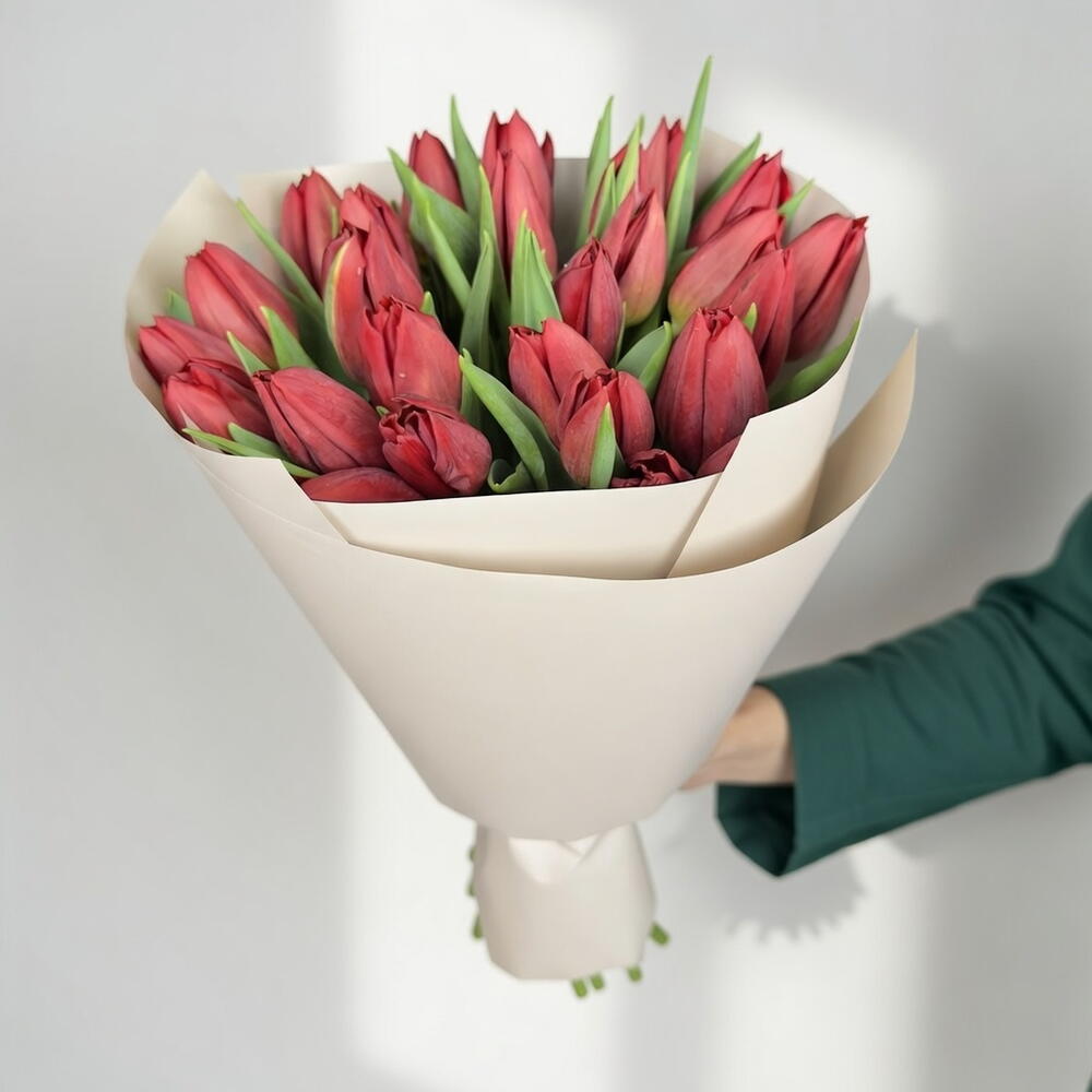 Ощутите завораживающую привлекательность этого моно-букета, состоящего из 25 потрясающих красных тюльпанов. Эти завораживающие цветы искусно оформлены, создавая роскошную, привлекающую внимание композицию, которая придаёт любому окружению нотку элегантности и страсти. Погрузитесь в богатство этих завораживающих красных тюльпанов, идеально подходящих для выражения любви, восхищения или просто чтобы скрасить любой день.