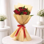 • 7 стеблей красных роз • 2 стебля «Песня Ямайки» • Красиво упаковано в бежевую упаковку • Завязано красным бантом