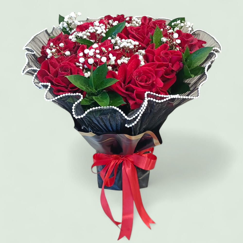Ярко-красные розы эффектно выделяются на фоне драматичной черной упаковки, дополненные нежной белой гипсофилой и ярко-красным бантом.