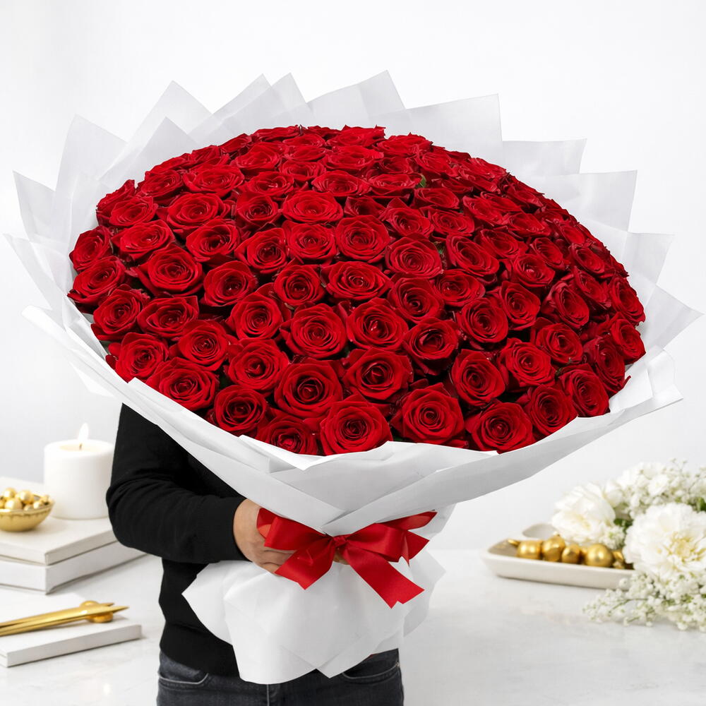 101 стебель: Красные розы Упаковка: Белая упаковка Завершение: Перевязано красной лентой