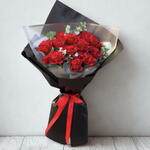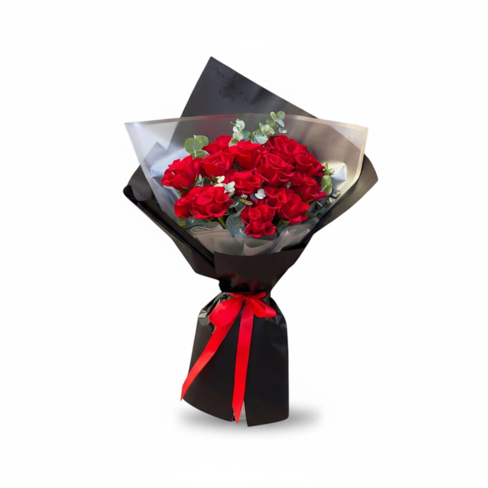 Red rose - 15 шт. Eucalyptus - 3 шт. черная бумага - 2 шт. прозрачная упаковочная бумага - 1 шт.