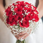 Романтичный свадебный букет с яркими красными розами, красиво контрастирующими с нежным рассыпанием белой гипсофилы. Стебли элегантно обернуты, создавая классический и страстный символ любви для невесты.